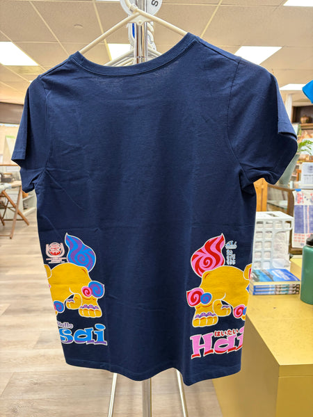 This stylish design features a colorful pair of shisa with the text "haitai" and "haisai" printed on each side of the shirt. Only available in ladies t-shirts.